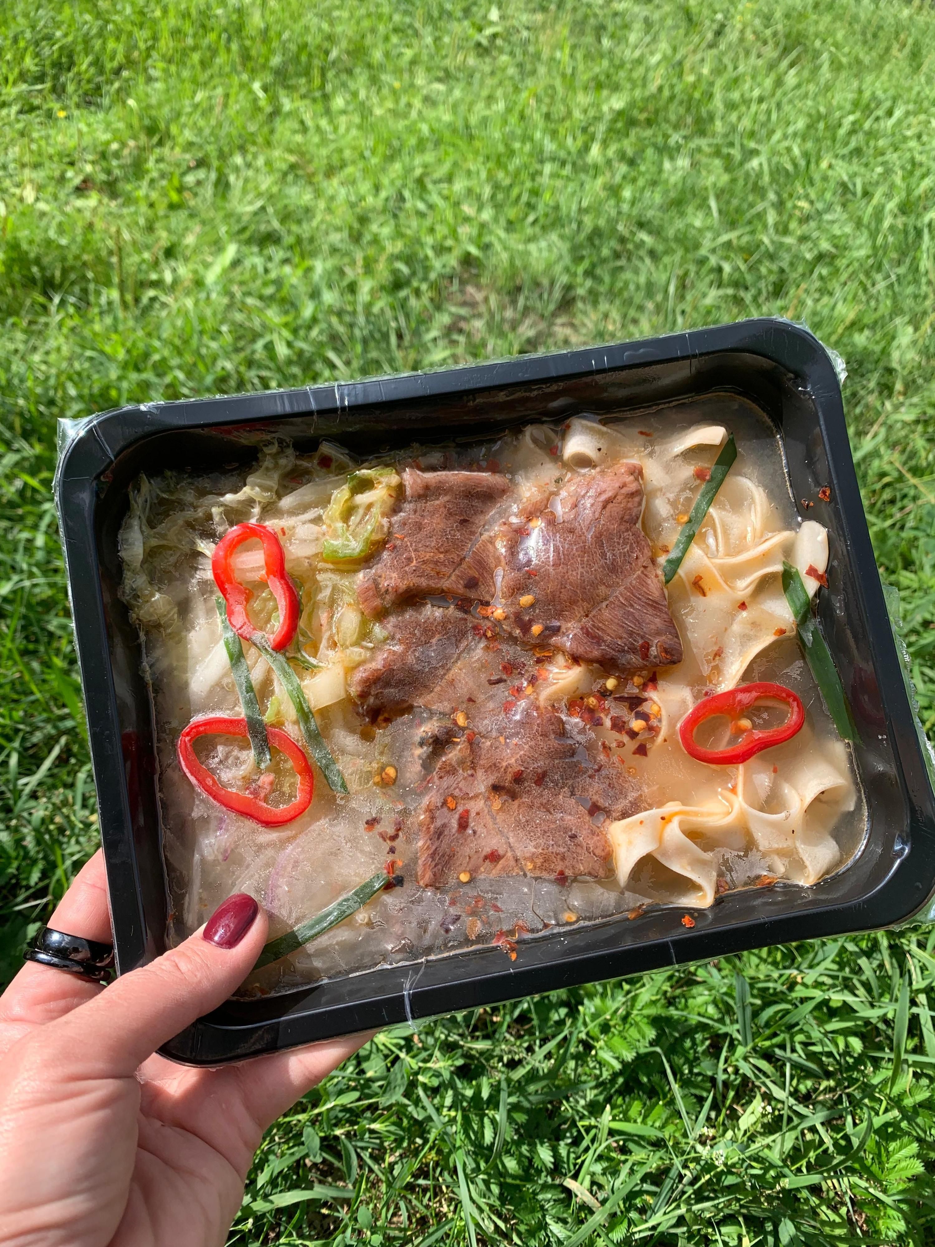 Состав Бульон говяжий, говядина, лапша рисовая, капуста пекинская, лук красный, перец сладкий, лук зеленый, масло подсолнечное, специи (бадьян, корица, гвоздика, перец красный, перец сычуаньский, чеснок сушеный).