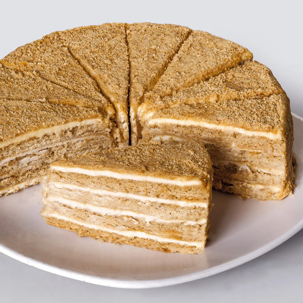 Нежные медовые коржи, пропитанные медовым сиропом и прослоенные кремом из деревенской сметаны.